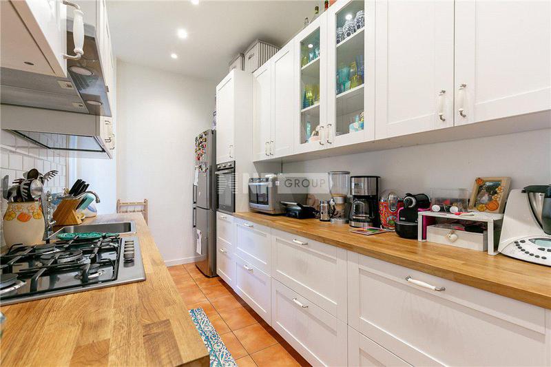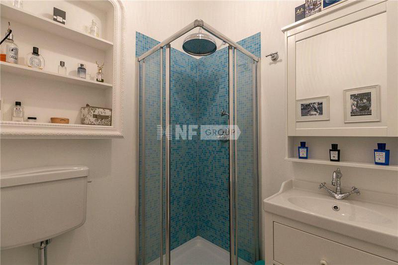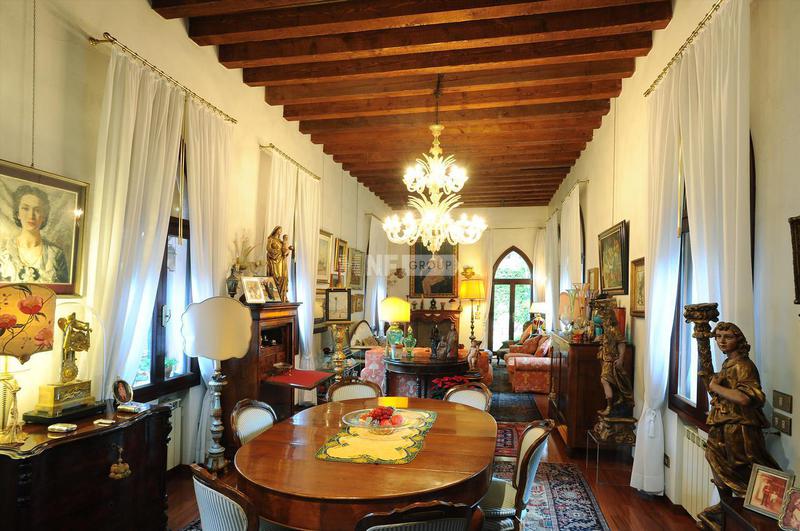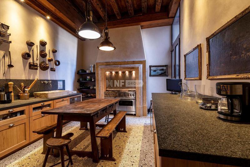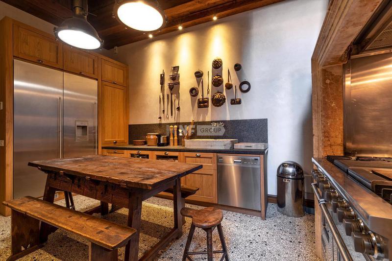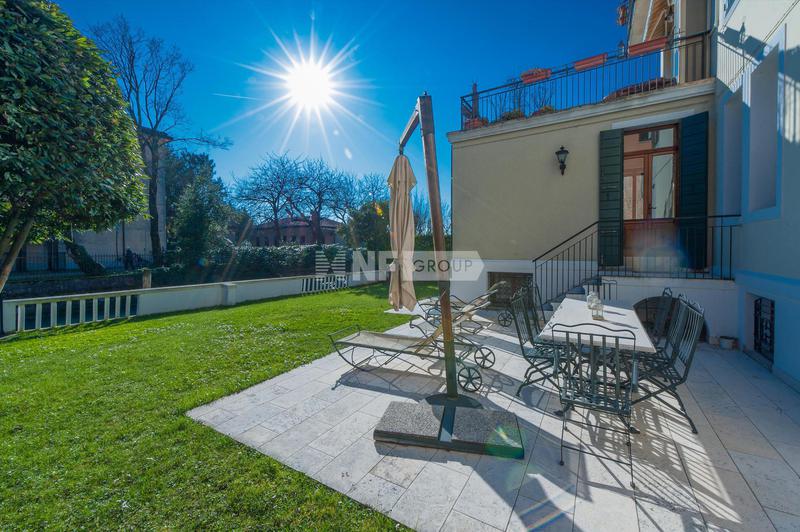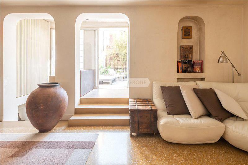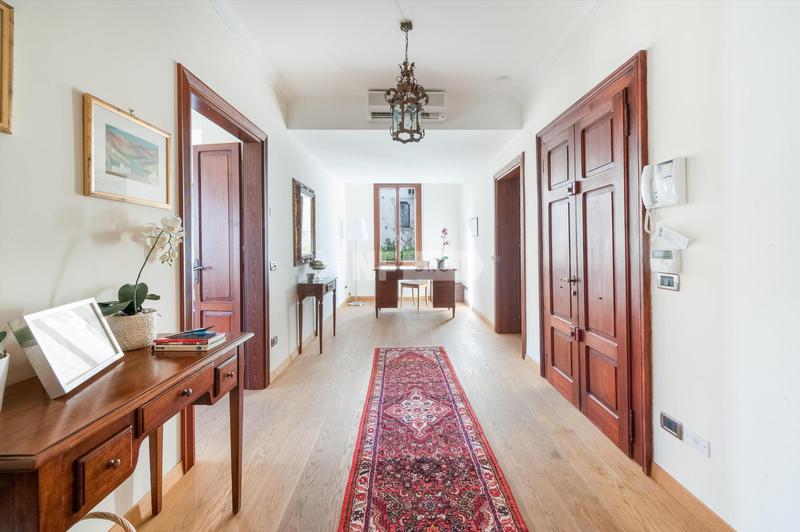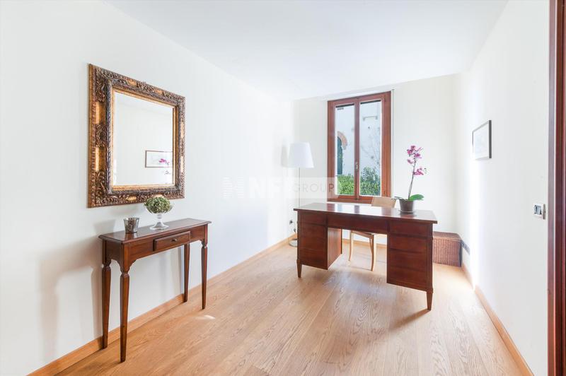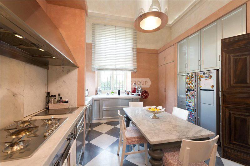 Квартира включает в себя две просторные комнаты для приемов. В той, что выходит в сад, есть восемь готических окон с красивыми декоративными лепными рамами, высокие потолки с открытыми деревянными балками, стены, оштукатуренные венецианской штукатуркой, и оригинальный мраморный камин. Отдельную вторую жилую зону можно использовать как библиотеку или кабинет с прилегающим подсобным помещением. Большая кухня оформлена в венецианском загородном стиле со встроенными приборами на заказ с эксклюзивной керамикой и шкафами из дубового дерева. Две спальни с двуспальными кроватями дополнены двумя ванными комнатами - одна с джакузи - и гардеробной.