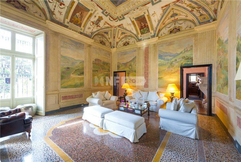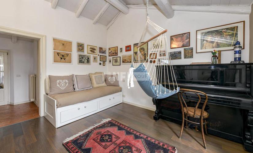 Квартира площадью около 600 кв.м. расположена на первом этаже великолепной виллы шестнадцатого века, принадлежащей семье Спинола, в окружении великолепного частного парка и с часовней, предназначенной исключительно для владельцев виллы. Доступ к нему осуществляется через элегантный вход с мраморной лестницей, но также есть частный лифт. Перед лестницей находится роскошный бальный зал необыкновенных размеров, с большими окнами и необычной отделкой. Большая приемная выходит на террасу около 50 кв.м., частично покрытую лоджией с фресками, где можно пообедать в любое время года и насладиться зеленью парка, в который утопает вилла. Зал красиво украшен фресками, лепниной, великолепным мраморным камином и полами из песка, где геометрические и цветочные узоры образуют большой ковер. Рядом со столовой гостиной находится кухня и большая кладовая. Есть две ванные комнаты и четыре большие спальни с инкрустированными деревянными полами и мозаикой, потолками с фресками и стенами, украшенными лепниной. В номерах также есть балконы и дополнительные открытые пространства. Многие частные парковочные места доступны для нескольких жителей виллы.