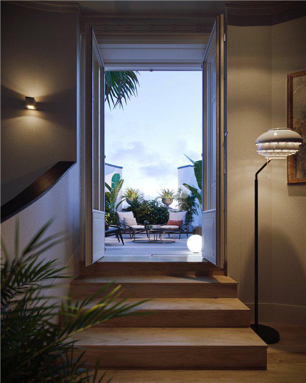 Квартира состоит из прихожей, гостиной с открытой кухней и обеденной зоной, главной спальни с гардеробной и ванной комнатой, еще одной спальни, ванной комнаты, прачечной, террасы и частного сада площадью 50 кв.м, в дополнение к 10 000 кв. м общего сада. Все номера будут иметь выход на частную открытую площадку.